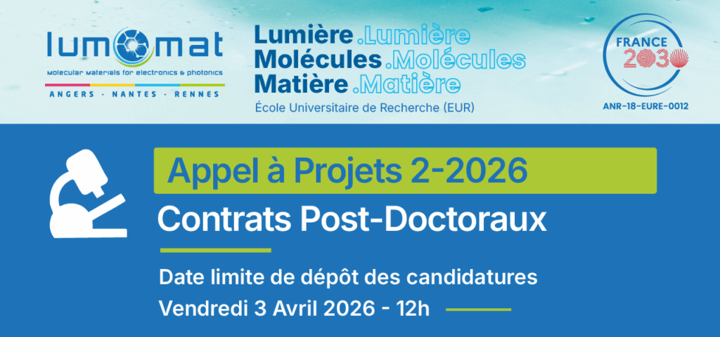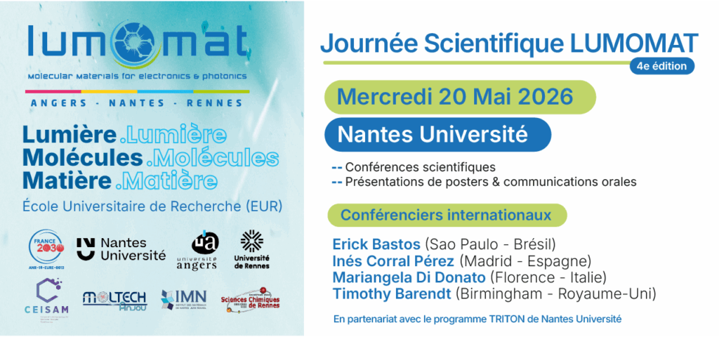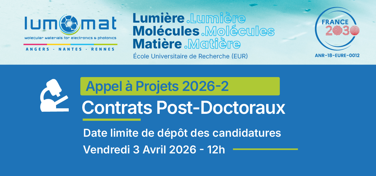 ÉCOLE UNIVERSITAIRE DE RECHERCHE DE CHIMIE Lumière,Molécules,Matière. Matériaux moléculaires pour l'électroniqueorganique et la photonique. Formations Nous proposons 3 formations d’excellence dans le domaine de la chimie : Cursus Master, Cursus Ingénieur (CMI) et Cursus Doctorat. Recherche Nous sommes impliqués dans 4 unités de recherche mixtes CNRS Universités, de 3 sites universitaires voisins : Angers, Nantes et Rennes. Innovation Nous sommes engagés auprès de nos partenaires socio-économiques, et garantissons une forte interaction avec l’industrie. International Nous entretenons des partenariats avec des universités du monde entier, et proposons des doubles diplômes internationaux. Domaines d'application Matériaux pour l'énergie Cellules solaires organiques, photosynthèse artificielle, OLEDs. Matériaux pour la santé Sondes et capteurs pour des applications médicales. Matériaux pour l'environnement Sondes et capteurs au service de l’environnement Matériaux pour le stockage de l'information Systèmes nanostructurés et imagerie Notre équipe Piétrick HUDHOMME Directeur pietrick.hudhomme@univ-angers.fr MurielHISSLER Co-directice muriel.hissler@univ-rennes.fr Vincent COEFFARD Co-directeur vincent.coeffard@univ-nantes.fr VirginieJOINNIN HROUCH Cheffe de projet virginie.joinninhrouch@univ-angers.fr LucieCARIMBACASSE-BABOU Gestionnaire administrative et financière lucie.carimbacasse-babou@univ-angers.fr FlorenceBÉCHEN Chargée de communication et de partenariats florence.bechen@univ-angers.fr