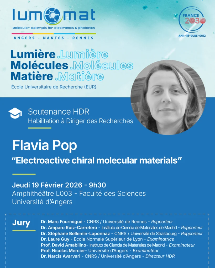 En Mars 2026, Sandrine Perruchas remplace Yann Pellegrin en tant que Responsable Scientifique au sein de la Commission Recherche de l’École Universitaire de Recherche Lumomat.