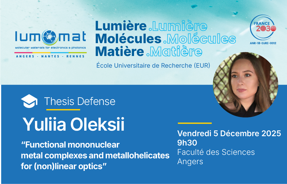 News Thesis Defense – Yuliia Oleksii – Friday December 5th 2025: Functional mononuclear metal complexes and metallohelicates for (non)linear optics Lire la suite » November 24, 2025