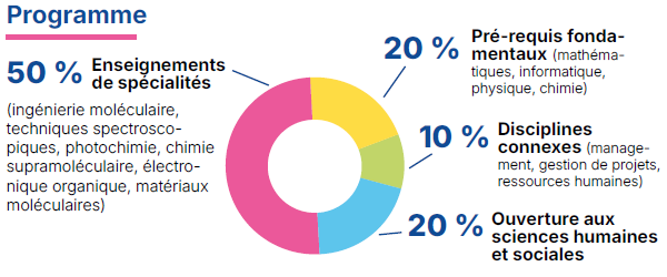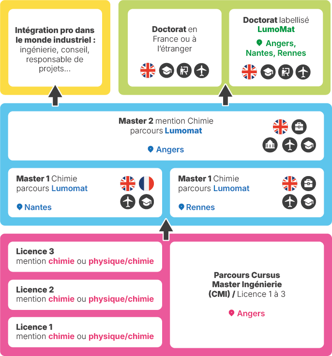 Le CMI Lumomat s’appuie sur la licence MPC / Physique-Chimie and le Master Lumomat (LUmière, MOlécules, MATières) pour former les chimistes de demain. Ce cursus est également labellisé Ecole Universitaire de Recherche (EUR) par l’Agence Nationale de la Recherche.
